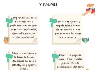 No se trata de convertir a los padres y madres en grandes expertos sobre la materia, pero sí de ayudar a dotarlos de estrategias y herramientas a las que puedan acudir para actuar adecuadamente ante situaciones en las que nosotras no podemos. Para ello, en primer lugar, es importante conocer ciertas bases fundamentales (posibles etiología, bases cerebrales, procesos cognitivos implicados, desarrollo evolutivo, mecanismos de acción…) sobre los distintos diagnósticos o conductas objeto de consulta. Adquirir esta información hará que se comprendan mejor los patrones conductuales visibles en el niño/a y qué la reacción de los padres y madres comience a tornarse más adecuada. En segundo lugar, es interesante saber qué, a través de la formación e información, estos padres y madres se pueden sentir apoyados y respaldados al conocer casos similares a los suyos y diferentes aportaciones para abordarlos. Por último, ante un diagnóstico se hace fundamental, poco a poco, ir adquiriendo información fiable al respecto para tener una buena capacidad de tomar decisiones que corresponde a padres y madres. Sabemos que escribiendo una conducta, reacción o un trastorno en el buscador de internet pueden aparecer millones de respuestas al respecto, y no siempre tienen que estar todas mal documentadas, pero suelen causar un batiburrillo de ideas u opiniones nada beneficiosas a la hora de actuar, además de generar aún más confusión. Por ello, se hace indispensable acudir a fuentes explicadas o redactadas por profesionales sobre el tema que puedan aportar información y estrategias útiles y científicamente avaladas.